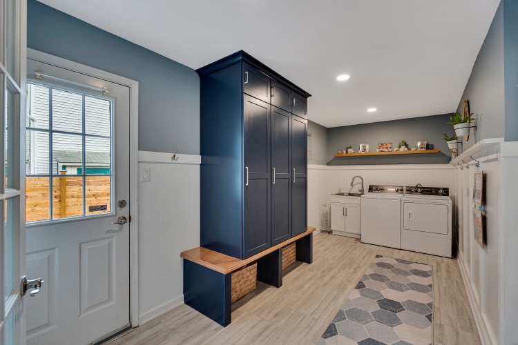 Off the kitchen, you will find a fantastic mudroom/laundry room boasting builtin locker style cabinets with room for seating and storage below. The washer and dryer are new and the utility sink is another big plus. This room is quite spacious and the perfect place to drop your after work/after school belongings. As the owner of this home, the mudroom is your access point from the attached two car garage (or from the rear patio), and how this home has stayed shoe free! A powder room and coat closet round out the first floor.