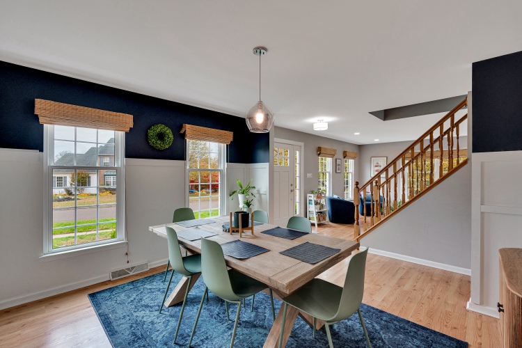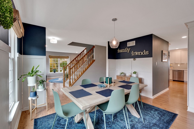 To your left is the living room, currently used as a playroom and workspace for the littles. To your right is the dining room featuring wainscoting and access to a butlers pantry that leads to the kitchen.