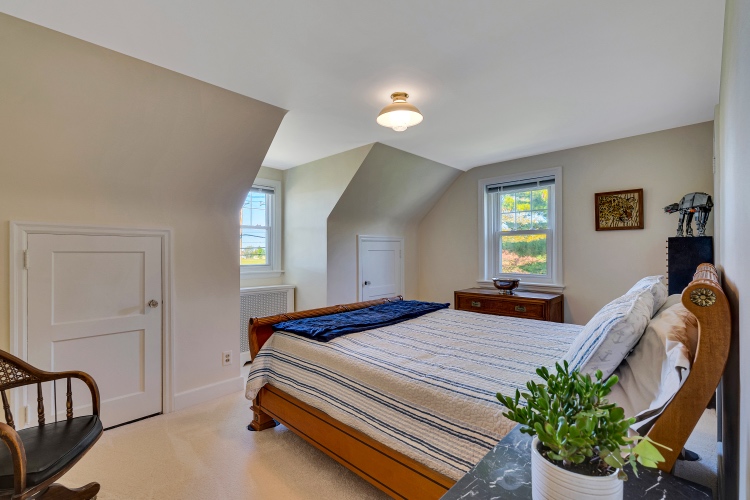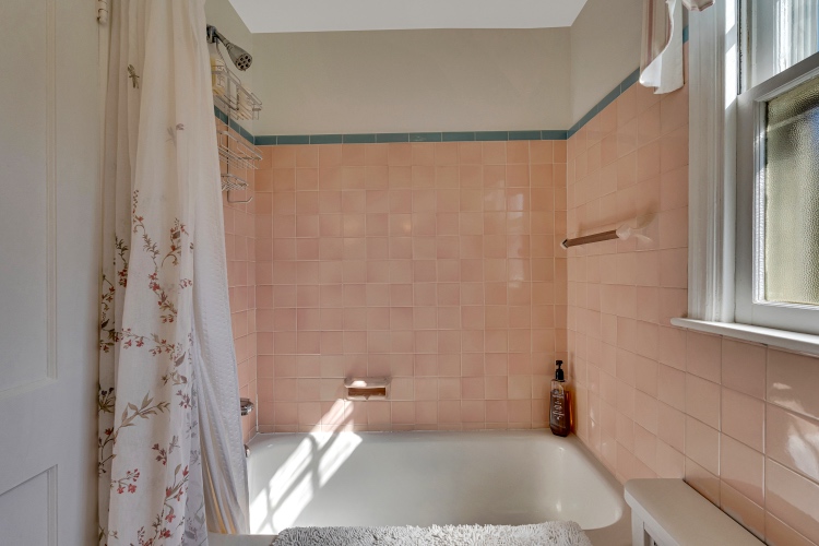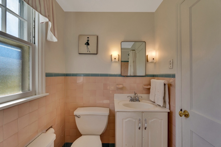Upstairs, you will find a sizable primary bedroom, two additional bedrooms, and a hall bathroom. The entire second floor boasts beautiful natural light and plentiful closet space. The carpet is in great condition and there is original hardwood flooring below. The full bath has a vintage feel in the best way.