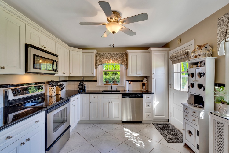 The kitchen is bright and cheery, offering plenty of workspace on the granite countertops, abundant storage, stainless steel appliances, the coveted window over the sink, and access to the rear patio and back yard.